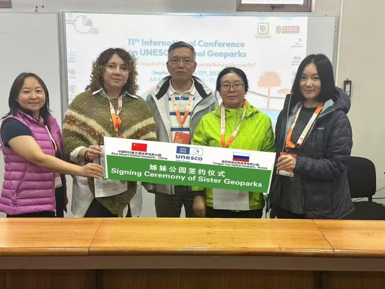 9月5日至12日,第十一届联合国教科文组织世界地质公园大会在智利库塔库拉(Kütralkura)世界地质公园成功举办。会议期间,阿拉善沙漠世界地质公园委托技术支持单位中国地质大学(北京)孙洪艳教授,代表阿拉善沙漠世界地质公园与俄罗斯扬甘陶世界地质公园正式签署姊妹公园合作协议,成功建立国际姊妹公园关系。这是阿拉善沙漠世界地质公园首次与国外世界地质公园建立正式合作,标志着其国际化进程迈出重要一步!