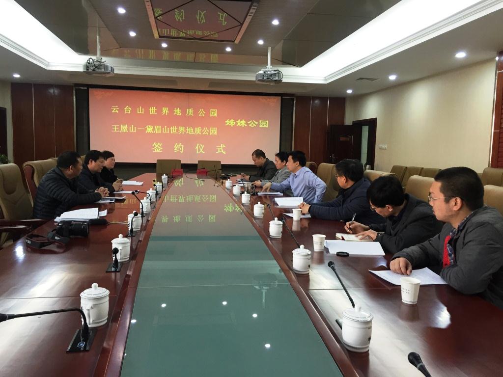 为加强地质公园之间的交流与合作,2月18日,河南省济源市国土资源局副局长冯长春带领王屋山-黛眉山世界地质公园管理局一行到云台山进行交流学习。双方就地质博物馆建设、再评估检查、地质科普知识普及、地质遗迹保护管理办法、地学公园人才培养等问题进行了探讨,并签约了姊妹公园友好合作协议书。