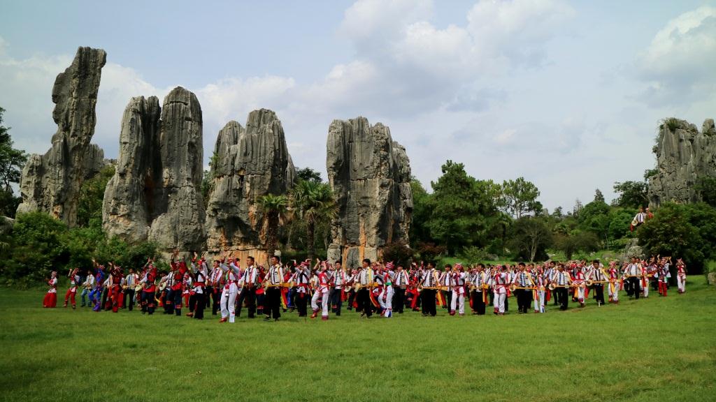 在拍摄现场,来自石林县维则村、蒲草村、舍色村的民间演出队以及石林景区艺术团的200名舞蹈演员以雄壮的石林为舞台,一起跳起撒尼人的欢乐之舞大三弦。悠扬的笛声和着热烈的大三弦,男子汉们身背三弦舞步强劲,姑娘们如彩蝶翩翩,好客的石林人欢迎来自远方的客人,精彩的场面吸引了诸多中外游客驻足观看。