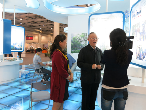 中国地质学会旅游地学与地质公园研究分会副会长陈安泽在展厅前接受媒体采访