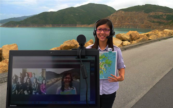 职员在万宜地质步道透过世界电子教室介绍香港地质公园的酸性火山岩岩柱
