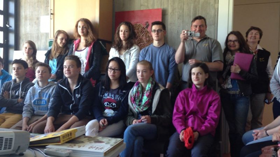 身在梅塞爾坑世界遺址博物馆的德国学生正观看香港职员介绍酸性火山岩岩柱