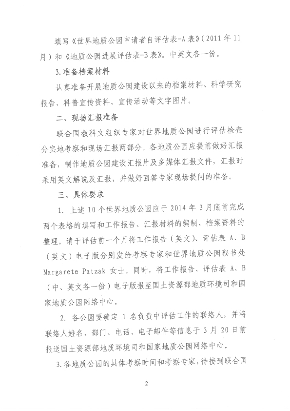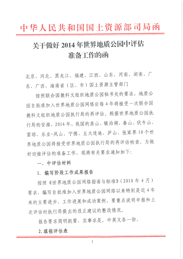 做好2014年世界地质公园中评估准备工作的函